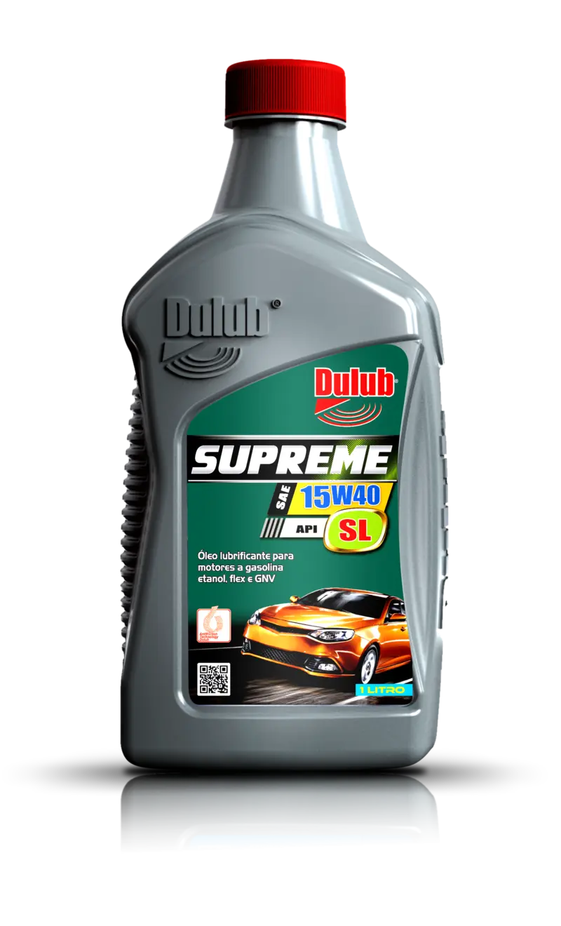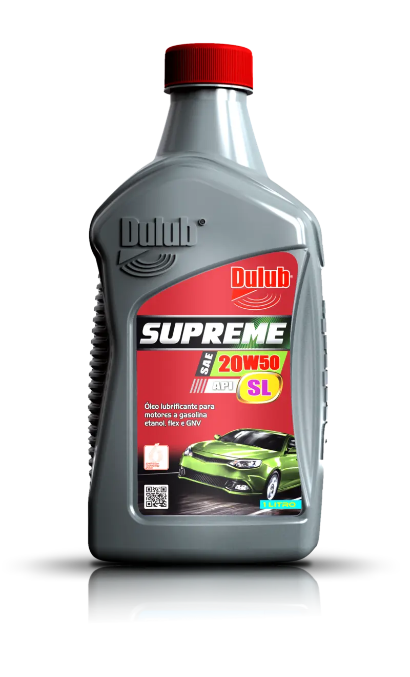 Óleo lubrificante mineral multiviscoso de última geração utilizado em modernos motores de automóveis atuais. Garante uma perfeita lubrificação do motor, tanto nas partidas a frio quanto nas temperaturas de funcionamento do veículo. O Dulub Supreme atende ao nível de desempenho API SL e é indicado para todos os motores a gasolina, etanol ou GNV de todas as marcas e potências. Possui Grau SAE 20w50. DULUB SUPREME 20W50 SL controla a formação borras e depósitos, mesmo a altas temperaturas, reduzindo os desgastes e a corrosão nas partes lubrificadas. DULUB SUPREME 20W50 SL possui elevada resistência a oxidação e aditivação que confere ao óleo superior estabilidade térmica, proporcionando excelente desempenho em temperaturas extremas e ignições rápidas. DULUB SUPREME 20W50 SL é indicado para uso em motores de todas as potências a gasolina, etanol, flex e GNV de veículos nacionais ou importados com injeção eletrônica e/ou multiválvulas, sendo compatível com os conversores catalíticos de automóveis modernos. Composição química: óleo mineral e aditivos anticorrosivo, antidesgaste, antiespumante, antioxidante, detergente, dispersante, agente de reserva alcalina e melhorador de fluidez.