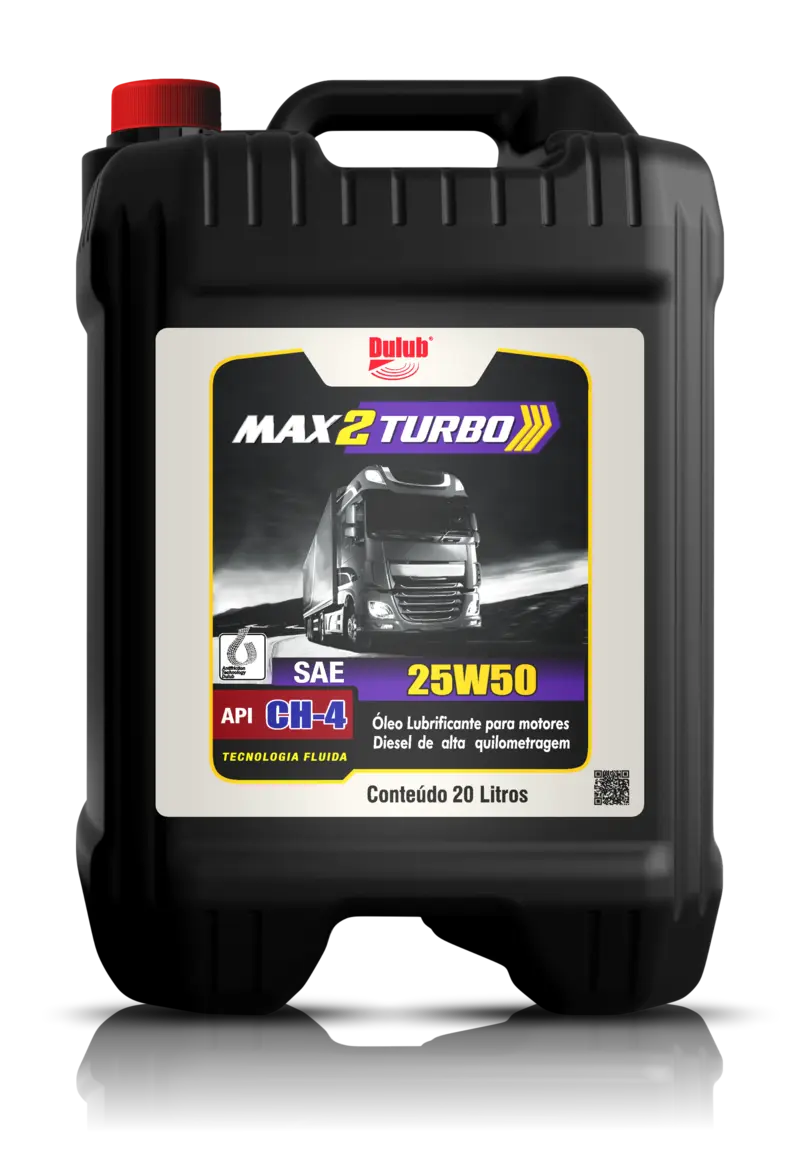 Óleo lubrificante de base mineral multiviscoso para motores diesel turbo alimentados e aspirados de alta quilometragem, de todas as marcas e potências que requeiram do lubrificante especificação API CH-4. Max 2 Turbo CH-4 possui Grau SAE 25W50 e atende a especificação API CH-4.